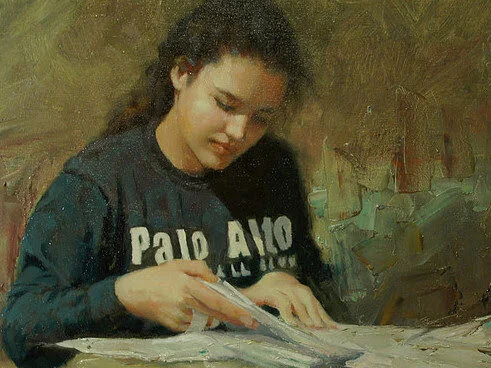 Typically we will work on each painting for two weeks. The first week with a new model, we will draw or paint to capture an accurate likeness and strong value statement. The second week we will make some corrections and then focus on color and edges. Students may also have the opportunity to continue working on their paintings and getting feedback using photo reference.