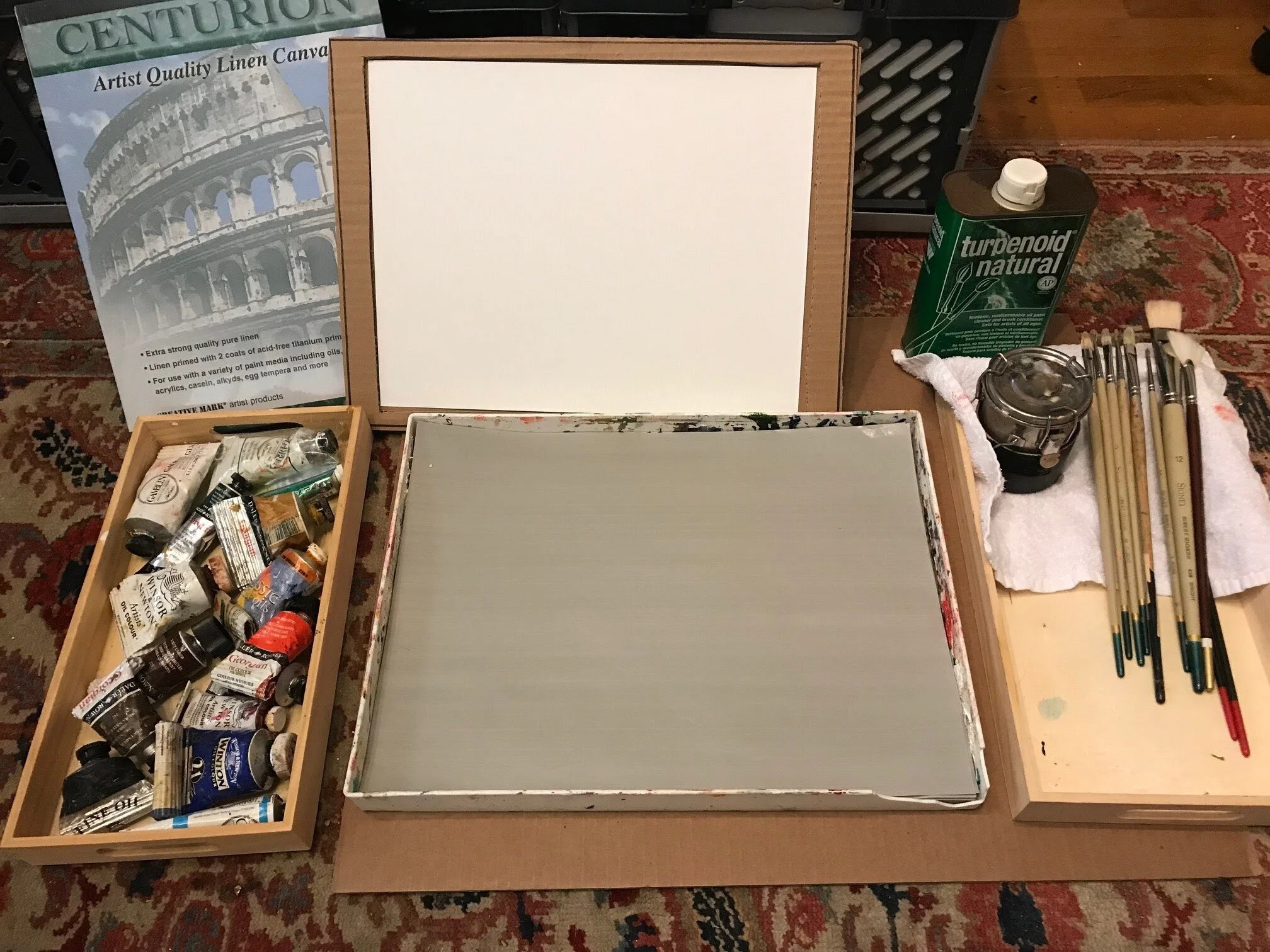 Shallow box with towel/rags to place turp jar and wet brushes while painting